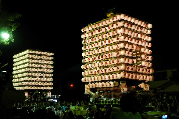 曳山(花山車)は、町内曳きを行って、16時半ごろに山倉に戻ってきた後に、ご神体や花飾りを取り去り、約400個の提灯を飾って(提灯山車)、けんか山へと化粧直しします。