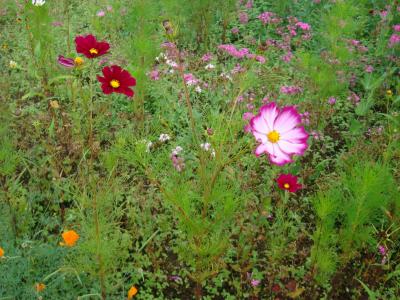 コスモスの草丈は2m程と良く成長し、赤やピンク、白などの花を咲かせます。