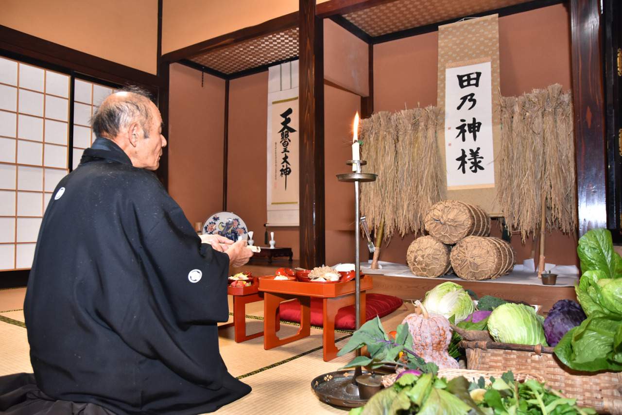 農家に伝わる神様への感謝の儀式。以前はそれぞれの家でひっそりと行われていましたが、伝統文化を後世に残そうということで、一般にも公開されています。