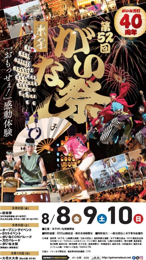 実は「がいな」とは鳥取の方言で「大きい」を意味するもので、がいな祭りとはそのまま米子の大きなお祭りということなんです。